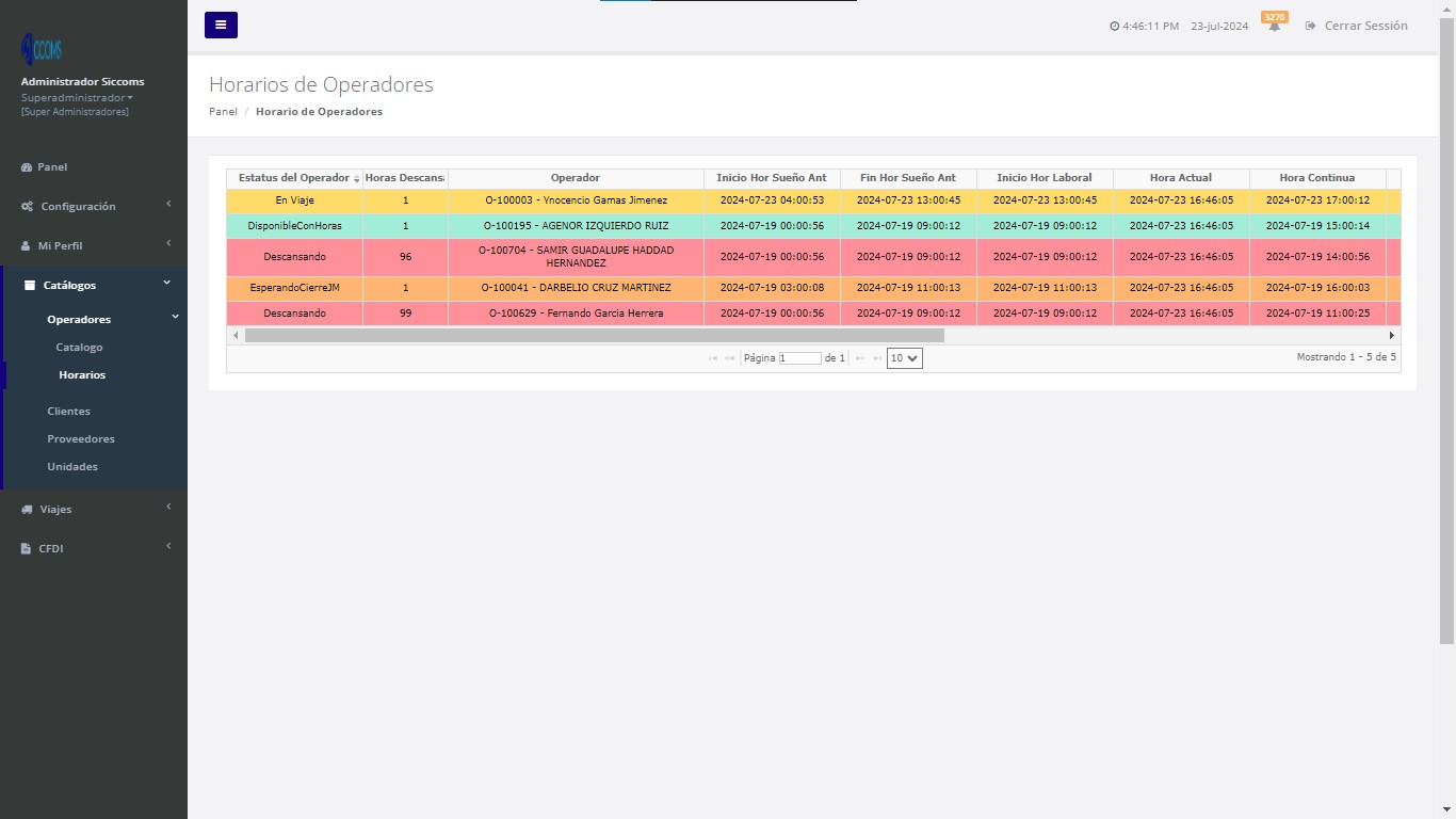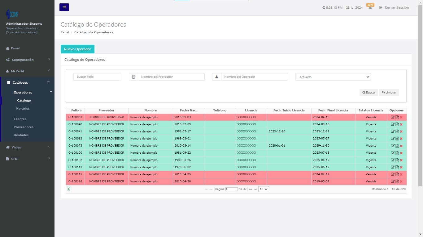 El submódulo Catálogo almacena todos los datos relevantes de tus operadores, incluyendo nombres, identificaciones únicas y estatus de disponibilidad. Implementa filtros para agilizar la búsqueda y mantén un control preciso con indicaciones de estatus en colores:
