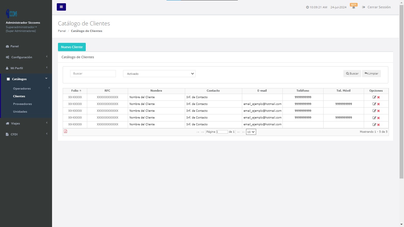 Nuestro módulo Clientes organiza la información en una tabla que incluye identificaciones únicas, RFC, nombres, correos electrónicos y teléfonos. Con funcionalidades adicionales como edición, visualización de detalles, generación de PDF y eliminación de registros, tendrás todo lo que necesitas para mantener tus datos actualizados y accesibles.